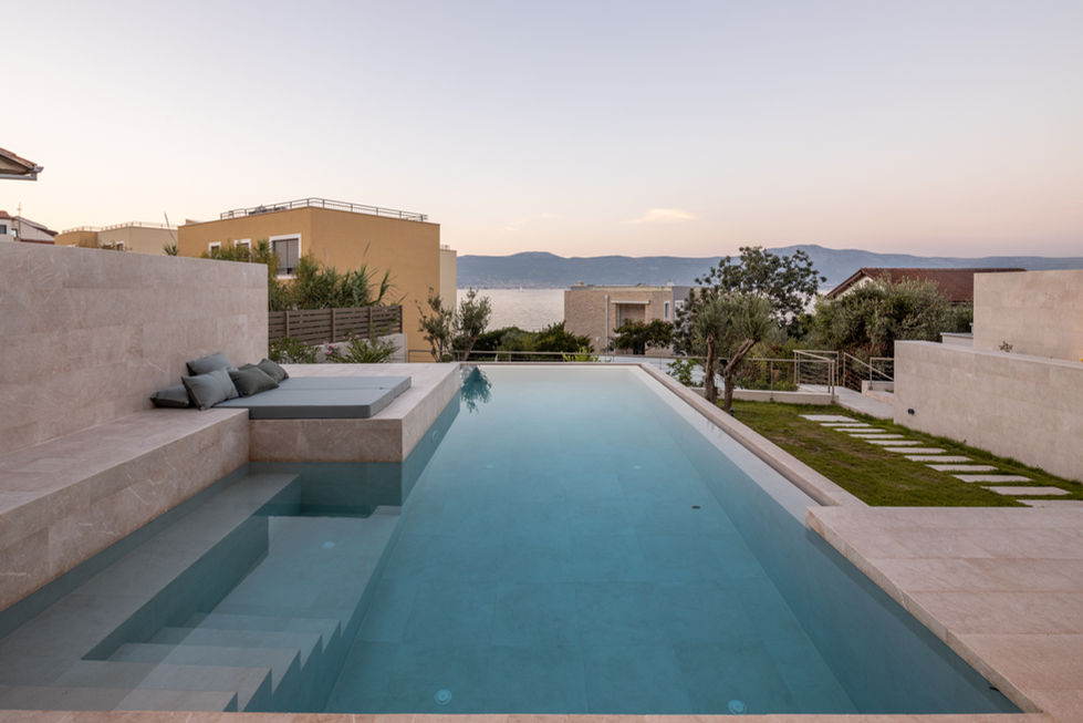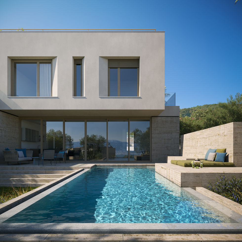 Kuće su dvije samostalne jedinice volumenski oblikovane kao jedinstvena cjelina. Zbog male parcele i nedovoljno privatnosti na terenu, boravak na otvorenom premještamo na krovnu terasu, a na terenu ostavljamo samo bazen i sunčalište zaštićeno od pogleda susjeda.